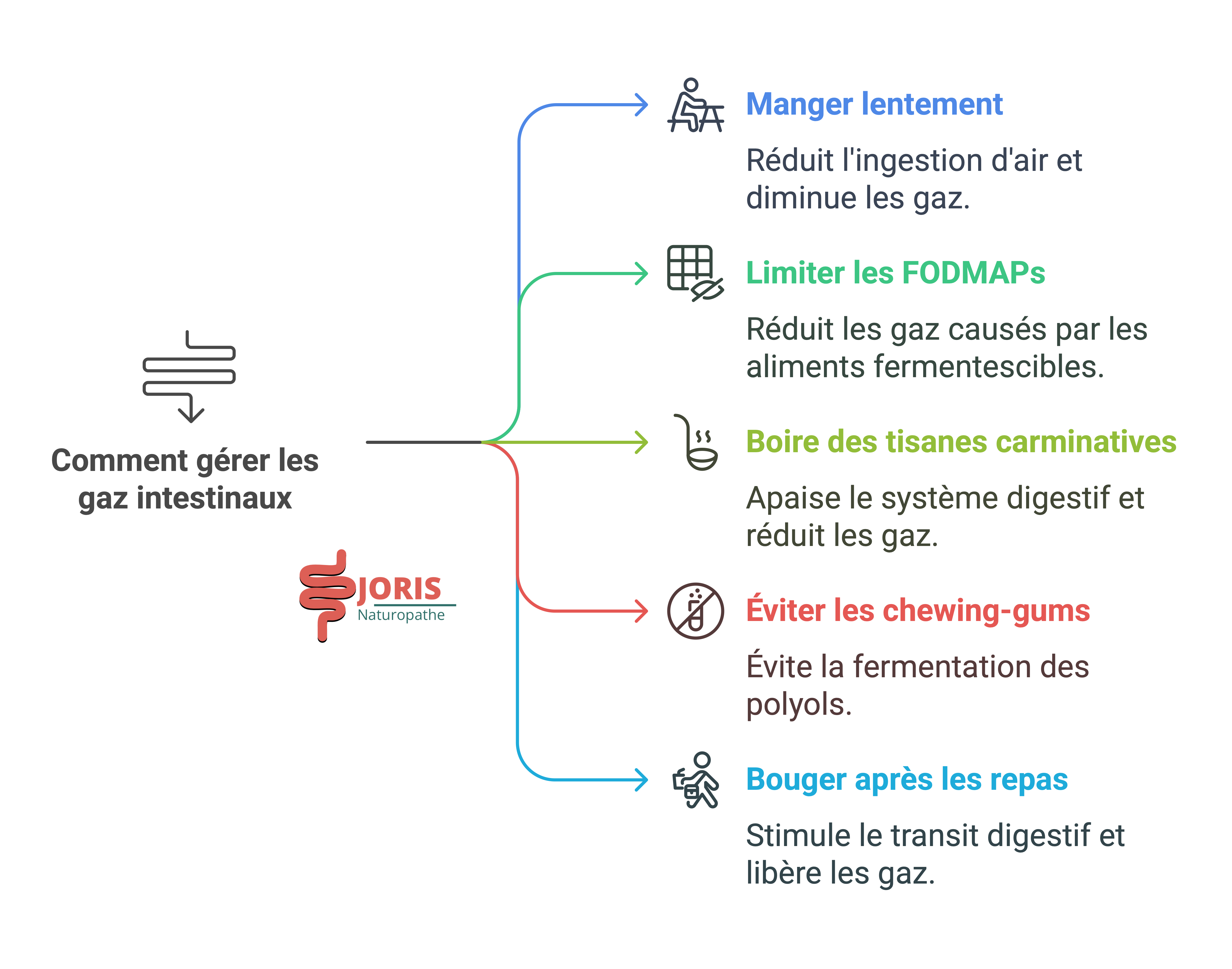 Limiter les FODMAPs : ces sucres fermentescibles sont souvent responsables des gaz intestinaux.