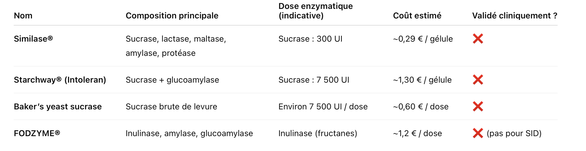 D’autres enzymes en vente libre (Similase®, Starchway®, etc.) peuvent être envisagées avec prudence dans une logique d’essai thérapeutique ciblé ;