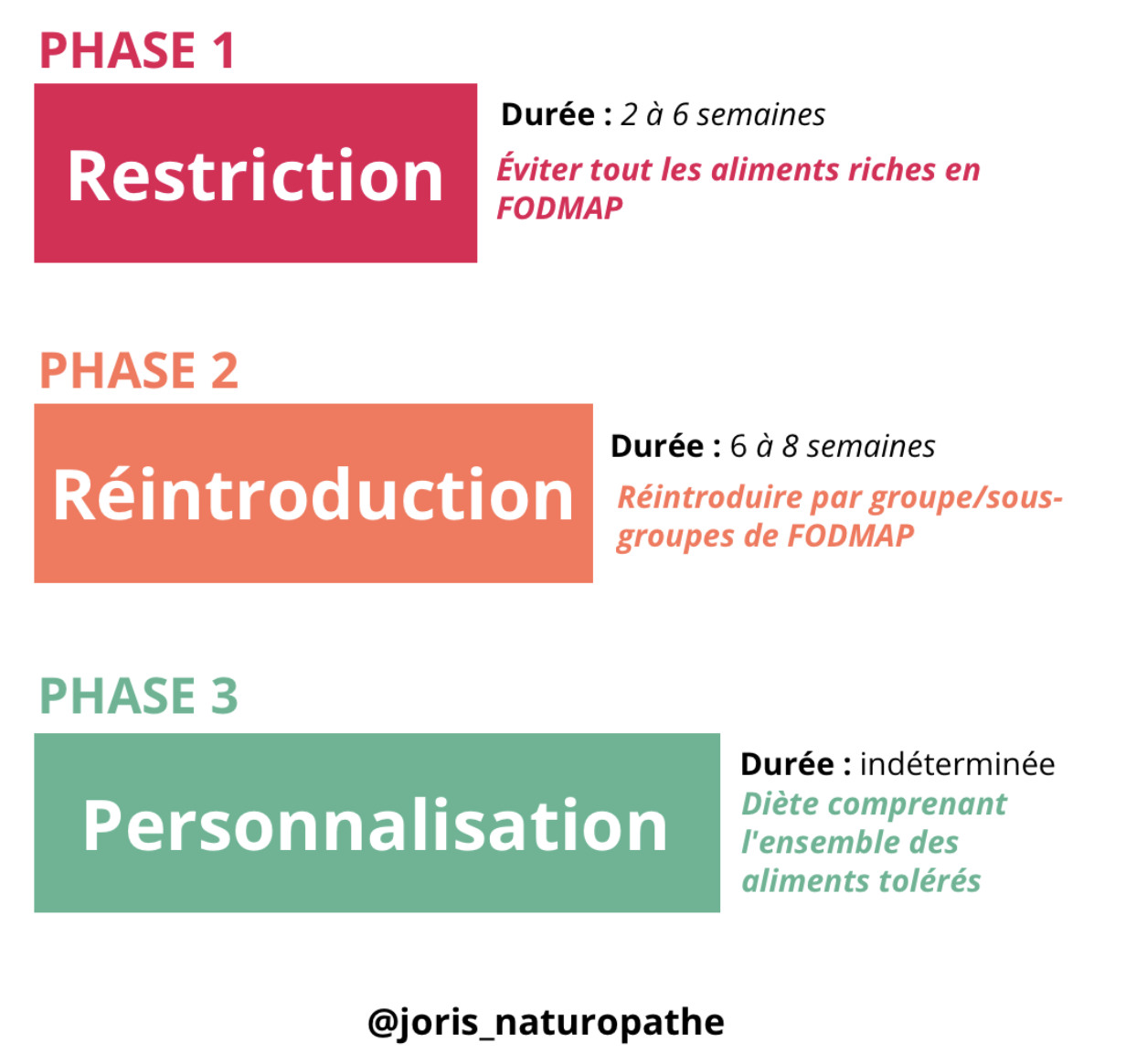 Le protocole sans FODMAP se constitue de 3 grandes phases :