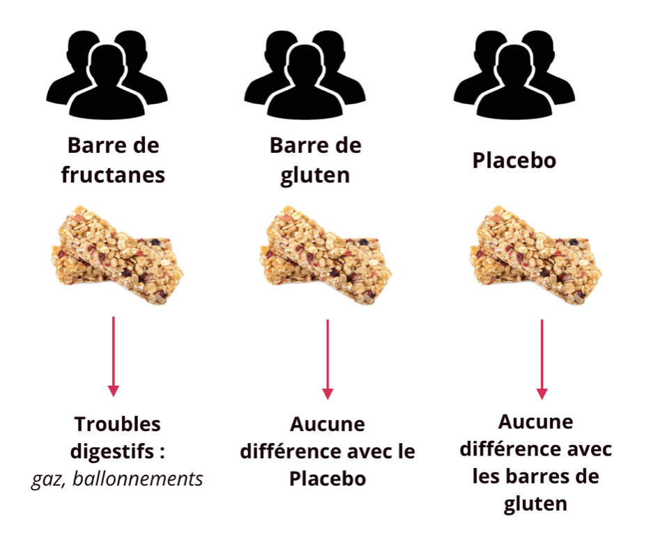 Les résultats, de façon très étonnante, n’incriminent pas particulièrement le gluten, comme on aurait pu le croire mais bien les fructanes ! En effet, les personnes consommant les barres de céréales contenant des fructanes ont eu plus symptômes digestifs que les personnes consommant les barres de céréales contenant uniquement du gluten !