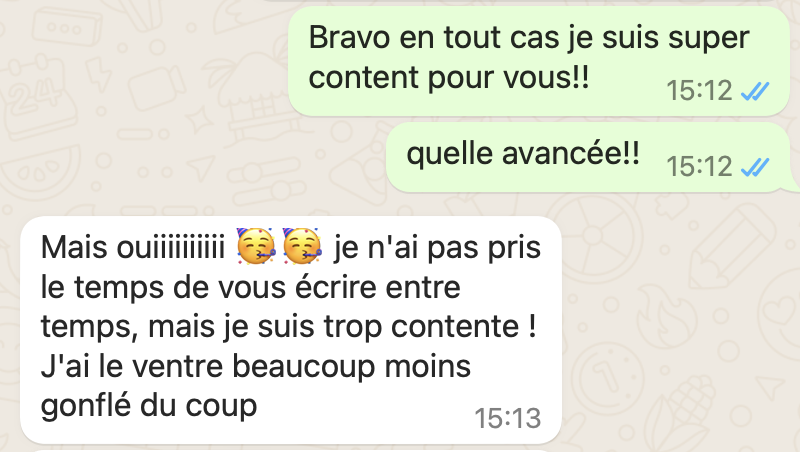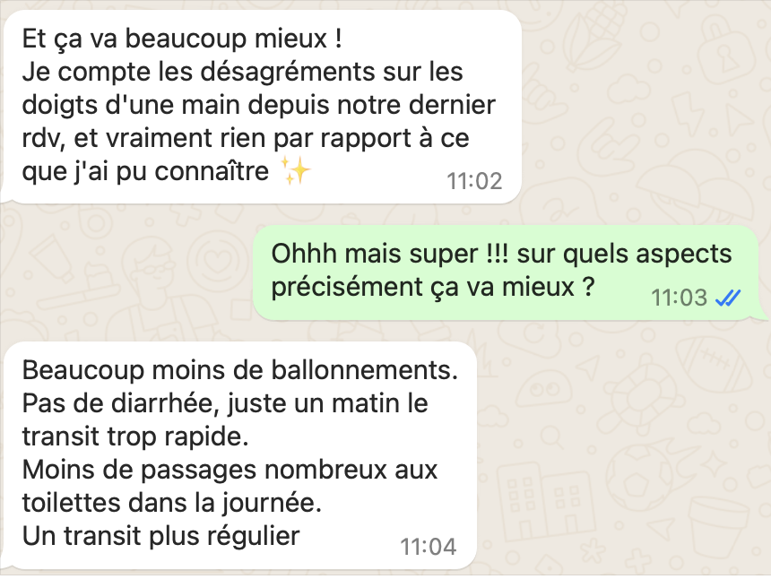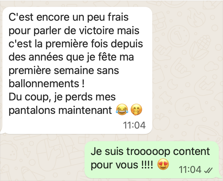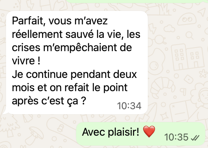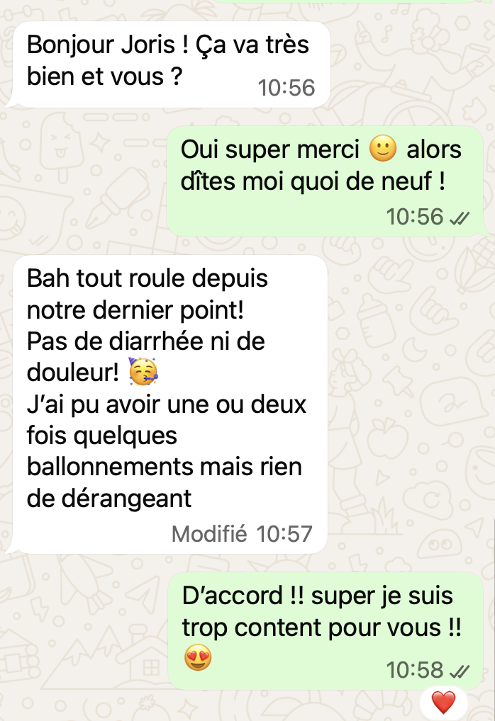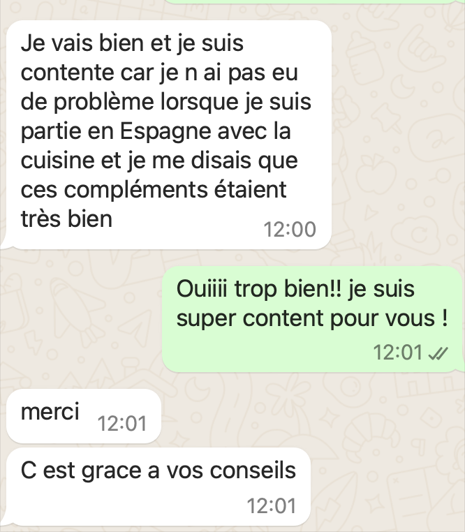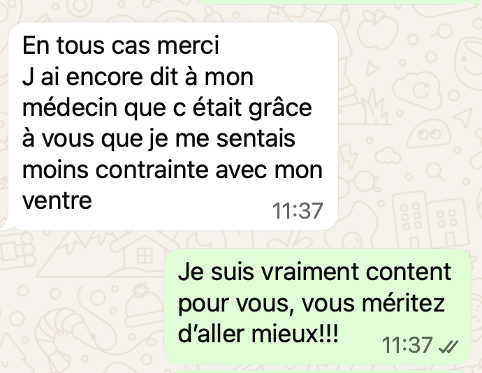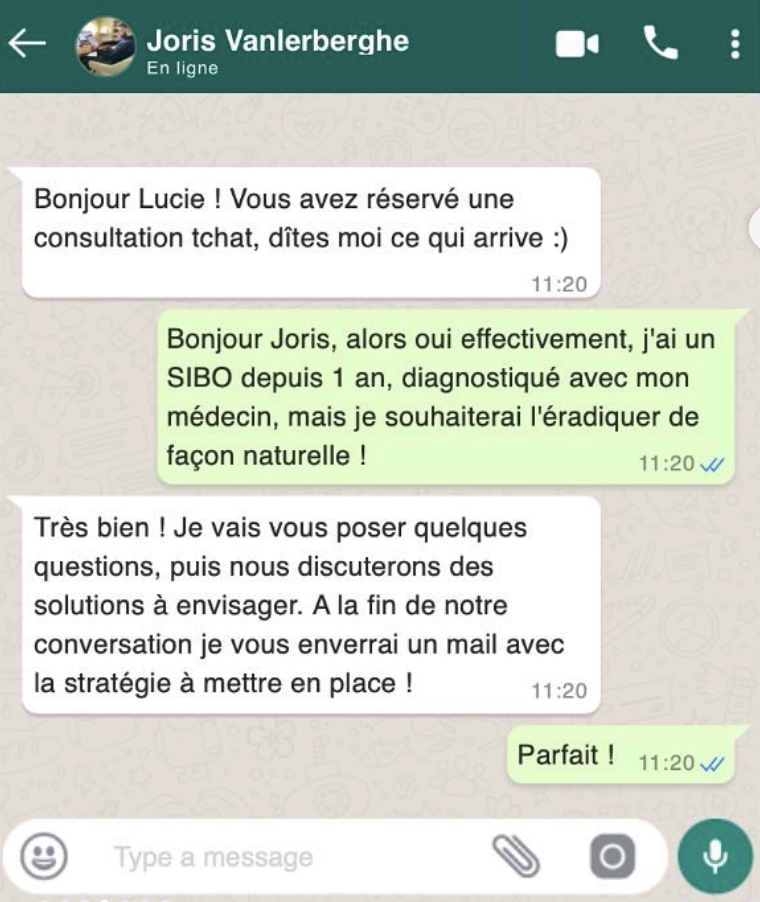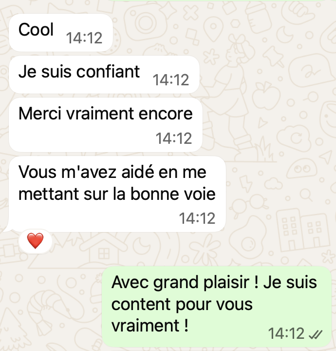 Une fois réservé, après votre réponse par mail de la façon dont vous souhaitez communiquer, voici quelques exemples de ce à quoi ça ressemble. C'est très simple : comme une conversation entre amis ! Vous pouvez évidemment répondre en message vocal pour gagner du temps.